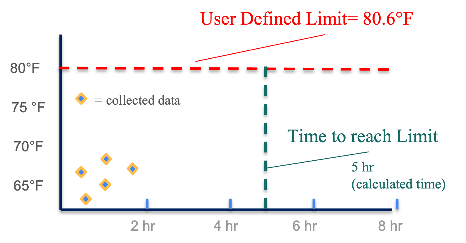 Purkay Labs’ predictive analysis collects real-time data from multiple sensors to monitor temperature changes in your data center. Using a linear regression equation (y = mx + b), the system predicts the time it will take for temperatures to reach a critical threshold, such as 80.6°F. The time to reach this limit, along with a confidence percentage, is updated every minute. If the projected time falls below 1 hour, the cooling unit is turned back on to prevent temperatures from exceeding safe operational limits.